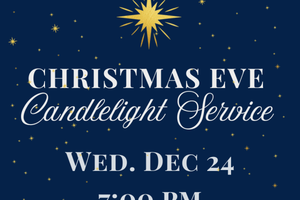 Our Candlelight Christmas Eve service will begin at 7:00 pm on Wednesday, December 24. This is a family-friendly service. We will have activity bags and battery operated candles for kids to use. The service will include carols, Scripture readings, a brief meditation, and communion. All are welcome.